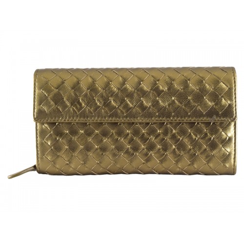 La belleza clásica del intrecciato de doble cara se revela en esta gran billetera de cuero meticulosamente elaborada. Con cierre de botón frontal, ocho ranuras para tarjetas de crédito, un billete y un compartimento para monedas.