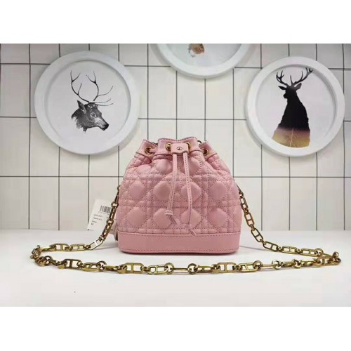Bolsa tipo cubo Mini Miss Dior en piel de cordero 'Cannage' flexible de color rosa.