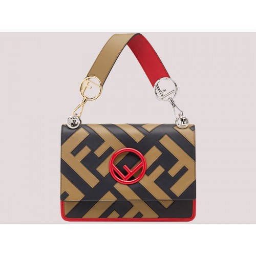 Bolsa con solapa y nuevo logo de Fendi. Cierre magnético. Bolsillo interior. Se puede llevar cruzado o con la mano gracias a la correa de hombro desmontable. Fabricado en piel de becerro negra con diseño macro FF todo insertado en tonos marrones. Bordes y detalles de piel roja. Artículos de metal con una combinación de acabados en paladio y oro.