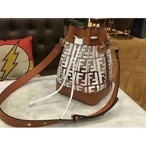 Bolsa tipo cubo Mon Tresor con cierre de cordón y decoraciones metálicas en forma de logotipo de Fendi. Dos correas de hombro desmontables, una larga y otra corta, para llevar el bolso con la mano, sobre el hombro o cruzado. Hecho de piel de becerro marrón. Patrón icónico FF en estampado en relieve y pintado a mano en negro. Artículos de metal con acabado dorado.
