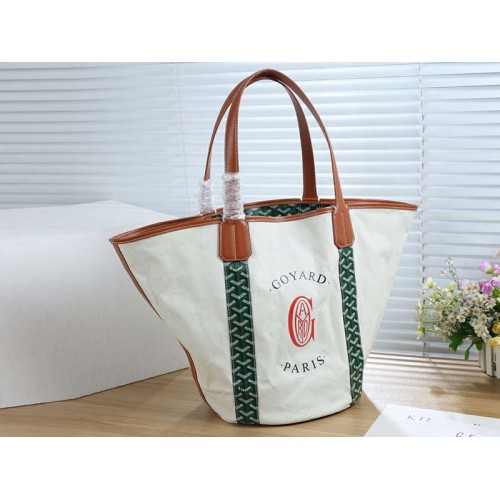 Edición limitada. De la tienda Maison Goyard Biarritz 2017. Lona recubierta de goyardina pintada a mano en color marfil y multicolor. Bolso Goyard Belharra Biarritz con ribetes de piel canela y costuras en contraste, tirantes planos dobles, interior reversible de lona crema con acento 'Biarritz' en la parte delantera y abierto en la parte superior. Compra bolsos Goyard y recógelos todos.