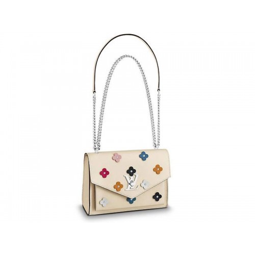 Para el verano ’18 el Mylockme BB está adornado con una lluvia de coloridas flores, inspiradas en la icónica Flor Monograma. Las flores de cuero se sujetan a la suave piel de becerro con remaches de metal, haciendo eco del cierre LV Twist con acabado plateado de la bolsa.