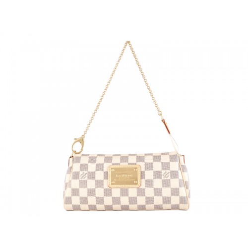El diseño es muy elegante y con estilo. El número de modelo es N55214.Está fabricado en lona Damier y piel auténtica. Viene con 15" correa de eslabones de cadena dorada. En el interior hay un forro con forro de lona beige. Preciosa placa dorada de Louis Vuitton se coloca al frente.