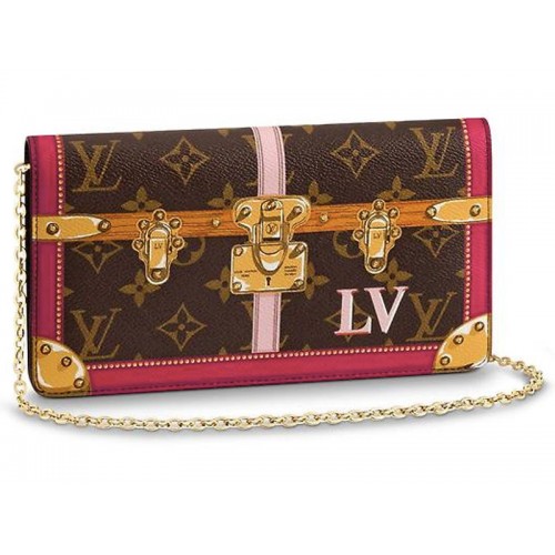 Haciendo referencia a la herencia de viajes de Louis Vuitton, el bolso de mano Pochette Weekend en el icónico lienzo Monogram está impreso con atrevidos detalles trompe-l'œil inspirados en los baúles históricos. También se puede llevar en el hombro gracias a su cadena extraíble. Esta edición coleccionable es parte del tema Trunk Summer 2018 que abarca zapatos, accesorios y artículos de cuero.