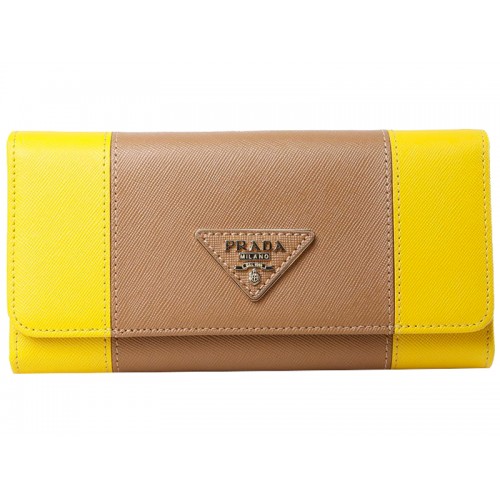 Cartera Prada de piel saffiano de tres pliegues en amarillo con caqui