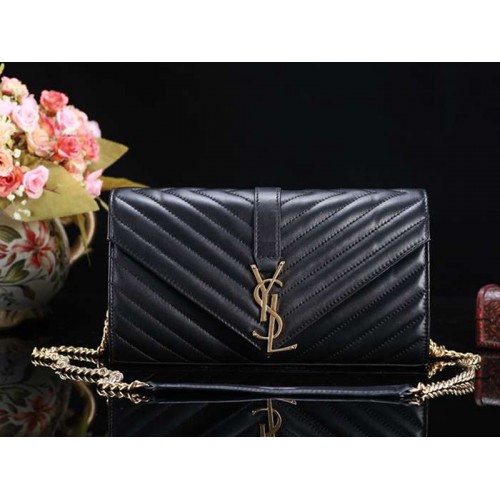 BOLSO FRONTAL CLASSIC FLAP CON FIRMA YSL DE METAL EN TONOS DORADOS, COSTURAS MATELASSÉ Y CORREA DE CADENA GOURMETTE DOBLE DE METAL QUE SE PUEDE USAR EN TODO EL CUERPO O EN EL HOMBRO.