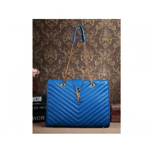 Bolso de compras clásico con monograma de Yves Saint Laurent en piel acolchada con textura Grain de Poudre azul real